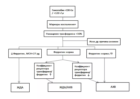 Исключение железодефицитной анемии (ЖДА) очень важно при диагностировании АХЗ, хотя эти два состояния часто сосуществуют. Как правило, сывороточное железо и насыщение трансферрина железом уменьшаются как при АХЗ, так и при дефиците железа, что указывает на ограниченное поступление железа в эритрон, но уровни трансферрина повышаются при ЖДА, тогда как при АХЗ они нормальные или снижаются. Измерение сывороточного ферритина часто неинформативно, поскольку ферритин является белком острой фазы, а также индикатором запасов железа, и его уровни будут повышаться при наличии воспаления. Золотым стандартом для оценки запасов железа биопсия костного мозга, но она имеет ограниченную ценность в диагностике АХЗ.