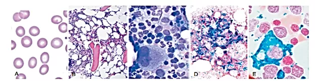 Рисунок 2. (А) Мазок периферической крови при АХЗ обычно демонстрирует нормохромную, нормоцитарная анемию. (B, C) Исследование костного мозга при АХЗ (морфологически норма) (D, E) Увеличение запасов железа с повышенным содержанием гистиоцитарного железа, но с пониженным содержанием сидеробластического железа.
