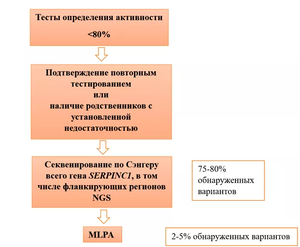 Согласно рекомендациям ISTH генетический анализ является вспомогательным в диагностике недостаточности протеина С. Молекулярная диагностика играет роль в подтверждении тяжелого дефицита протеина С, включая случаи пренатальных диагнозов, а также способствует выявлению недостаточности протеина С среди членов семьи [7,9]. Однако важно отметить, что большинство исследователей приходят к выводу, о целесообразности проведения молекулярно-генетического метода исследования при снижении активности протеина С ниже 70% [3,4,9]. При уровне активности протеина С выше 70% проведение молекулярной диагностики не рекомендуется из-за низкой вероятности обнаружения генетических вариантов [9].
