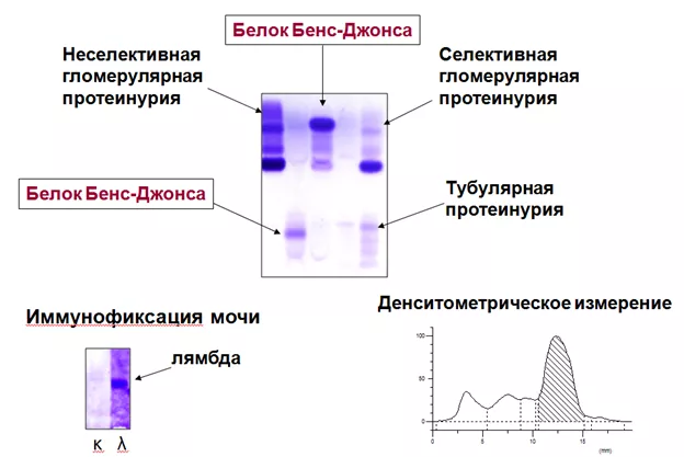 Протеинурией называют повышение содержания белка в моче, которое является клинико-лабораторным показателем нарушения функции мочевыделительной системы при различных заболеваниях. При измерении концентрации белка в моче диагноз проетинурии устанавливается при повышении его содержания более 1,0 г/л. В отличие от измерения концентрации белка с помощью биохимических тестов, электрофорез белков мочи позволяет не только выявить, но и охарактеризовать спектр выделяемых белков с помощью полуколичественного измерения белковых фракций. При обнаружении патологической белковой фракции (белка Бенс-Джонса) тест считается положительным независимо от концентрации общего белка.